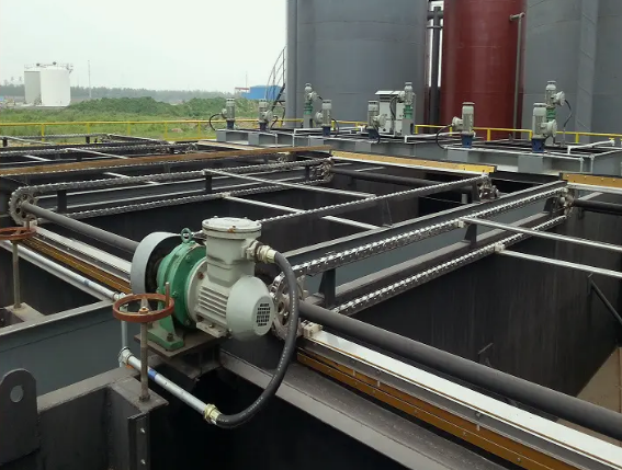 在分離區(qū)起端刮板放下,插入液面,向前進(jìn)行刮渣,將渣刮入排渣槽,到終端是刮板抬起,脫離液面,刮渣機(jī)返回,開始下一個(gè)循環(huán)。